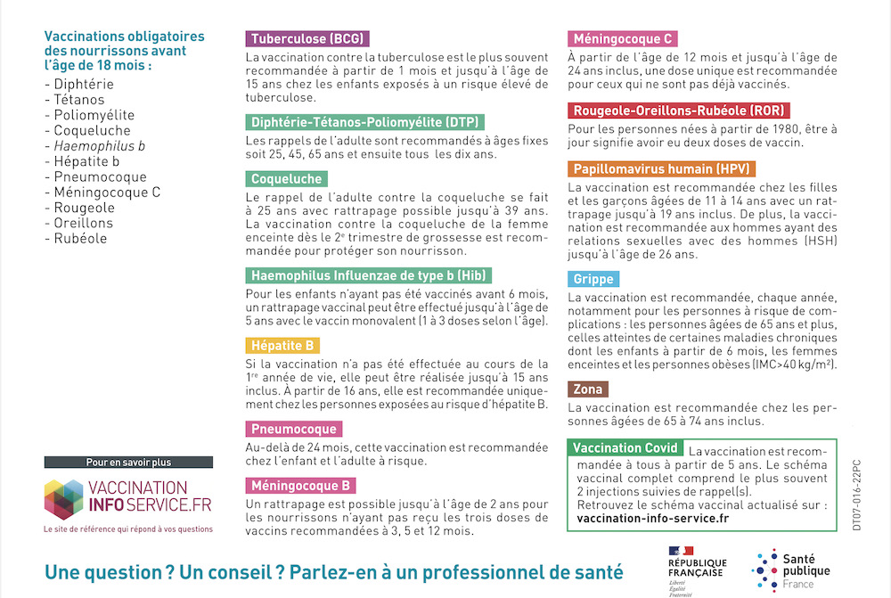 Nous nous assurons également de vous tenir informé des recommandations de vaccinations en vigueur et de vous fournir les conseils nécessaires pour prendre les meilleures décisions en matière de santé.